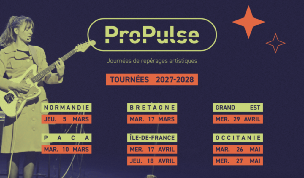 Les spectacles susceptibles d’intégrer les tournées JM France sont repérés essentiellement lors des journées ProPulse, organisées en régions sous forme de rencontres, écoutes et échanges entre équipes artistiques et acteurs culturels du territoire. Le repérage se fait en vue d’une diffusion des spectacles à N+2, l’année N+1 étant dédiée à la mise en place des tournées.